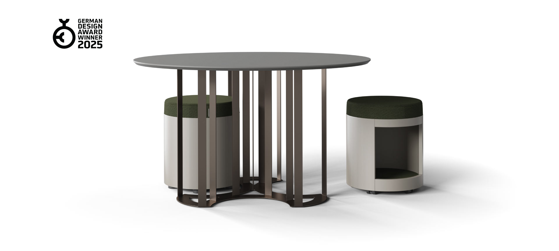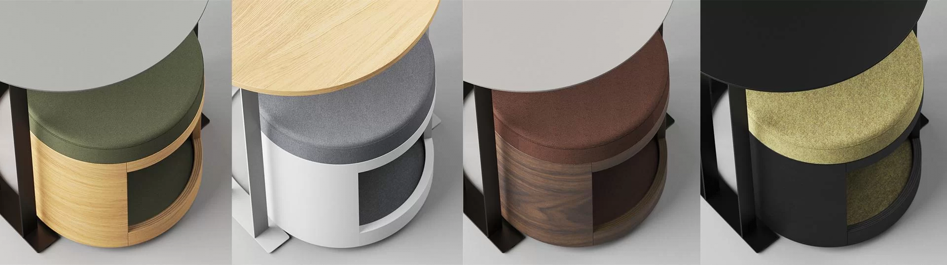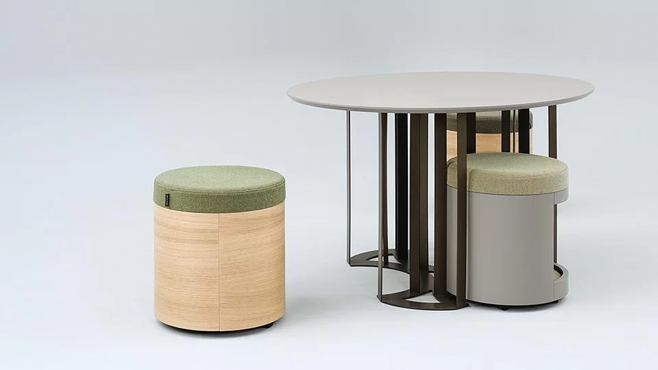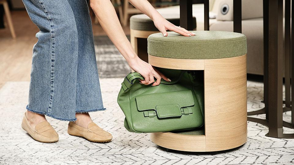 The compact poufs in the collection can be hidden under the coffee table with a light push and pulled out again to create a pleasant place to sit. This design solution makes efficient use of office space without cluttering it. The niche in the pouf is ideal for temporarily storing small items or simply a handbag during a meeting.