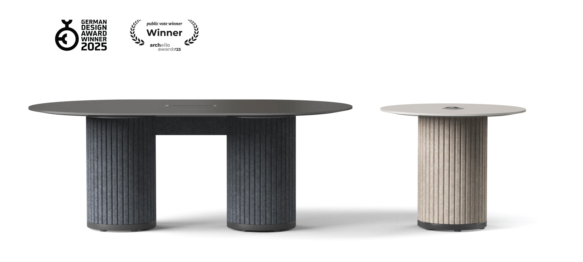The main design element of the furniture from this collection is a sculptural cylindrical column, which has historically symbolised strength and stability in architecture. With a modern interpretation, this element of classical architecture becomes the unifying and distinctive design accent of the PARTHOS table collection. The cylindrical column is covered with PET felt, whose textural pattern of vertical lines further emphasises the allusion to the element of classical architecture.