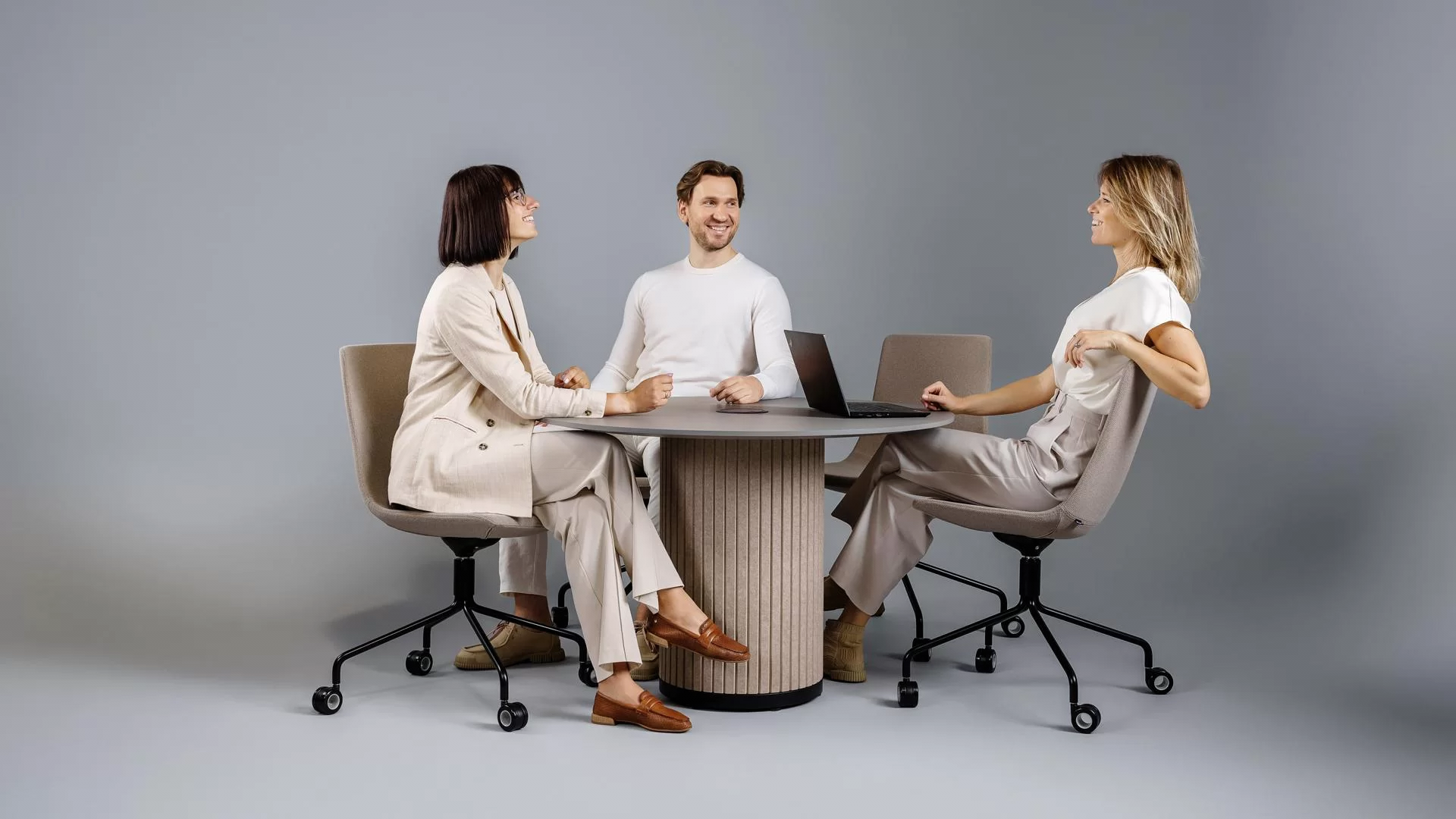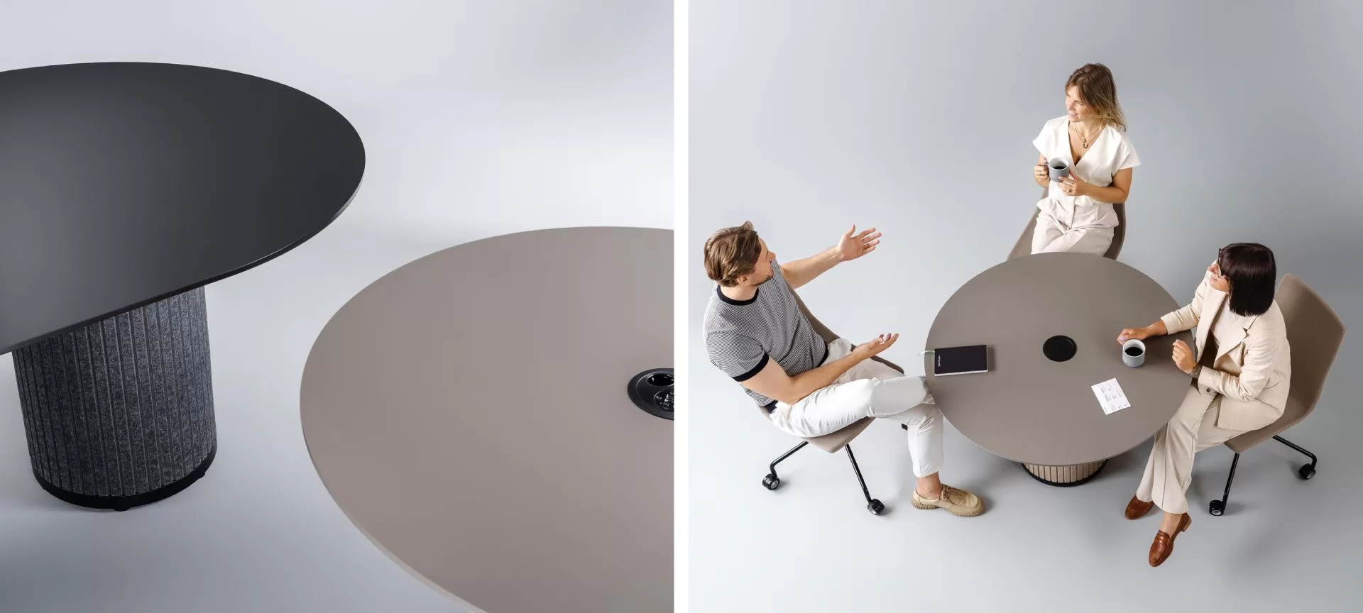 To maintain the thoughtful, visually uncluttered design of the PARTHOS tables, a great deal of attention was paid to the search for shape. Round lines are echoed in the tabletop and cylindrical column, so it was important to find a balance of sizes and proportions between these parts. Round tables are ideal for pleasant collaboration: we can see and hear each other well, actively share ideas and information, engage in conversation and find solutions.
