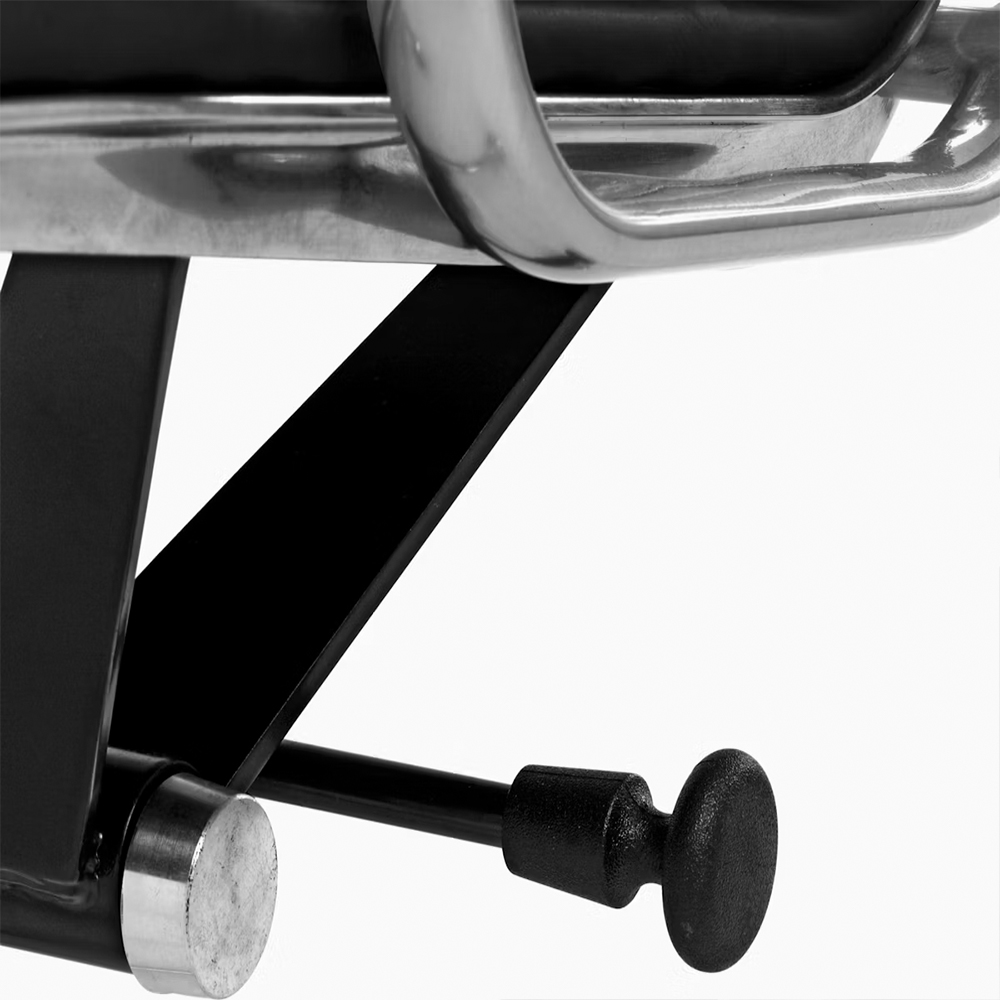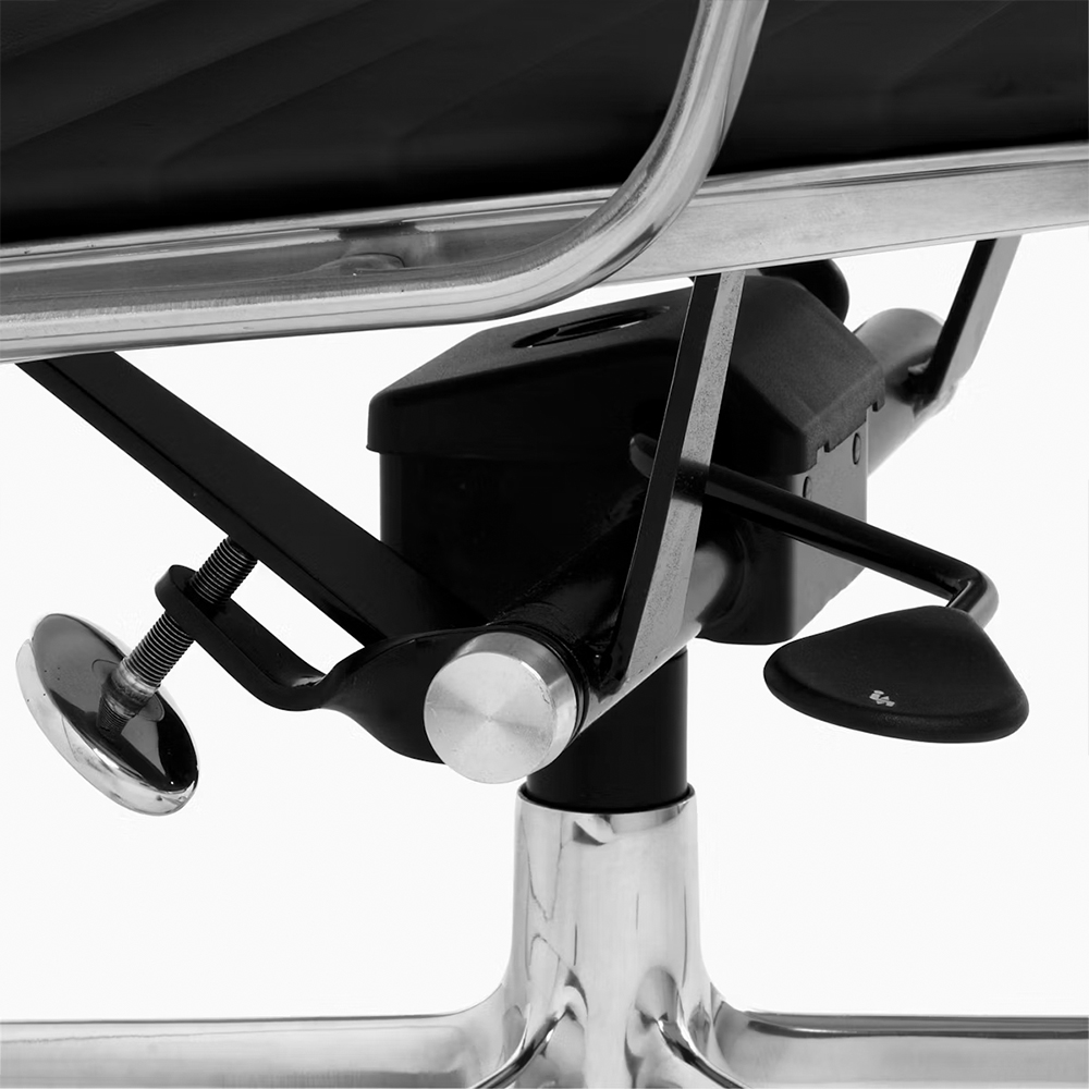 • The second image highlights the lock mechanism, enabling users to securely fix their preferred seating position. The entire system is seamlessly integrated, preserving a clean and refined look. This approach is a hallmark of Eames design — where form not only follows function but enhances it.