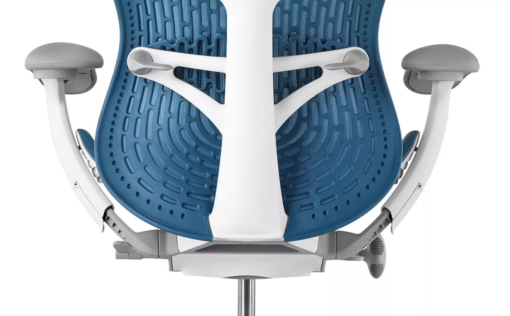 The back part of the chair is manufactured from the polymer. The carcas of the back embodies the back of the seater that supports the spine without a pressure. Butterfly back is a patented technology with an integrated adjustable lumber support that distributes the pressure evenly during the leaning on the back. Posture fit repeats the contours and micro movement of the body supporting the sacral part of the spine. Adjustable lumber support the lower part of the back.