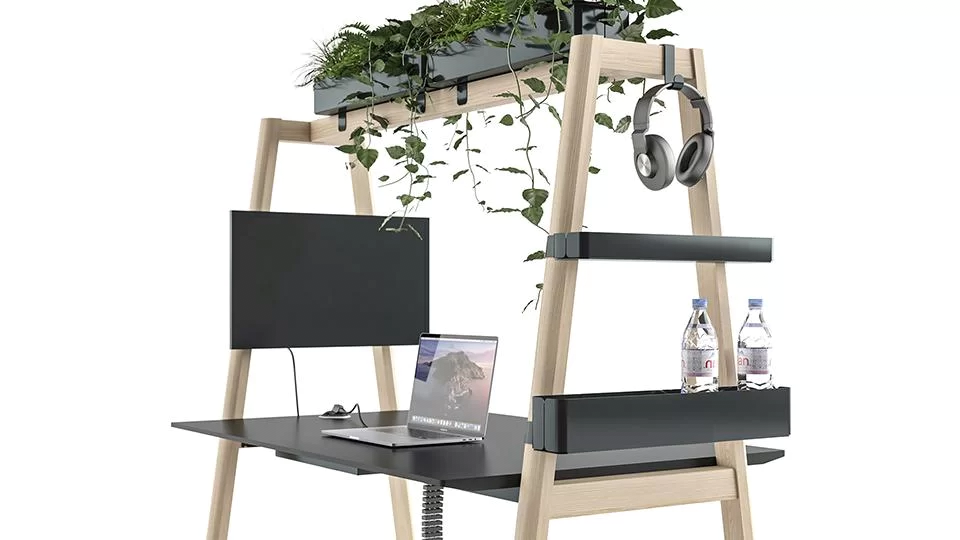With the help of accessories, you can create a functional and uniquely styled space. You can easily attach a display screen or a writing board to the table legs. Meanwhile, the shelving units will be a perfect place to accommodate water bottles or small office supplies. The office plants placed on top of the shelving units will help to create a more homely and private atmosphere. The electrical solutions integrated into the tabletop will ensure convenient access to power for your meeting equipment.